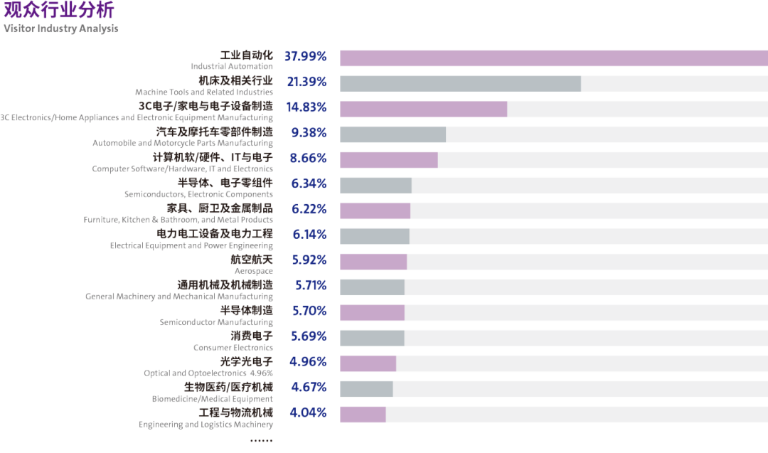 由往年观众数据分析可以看到,来自自动化、机床 、3C电子、汽摩制造、计算机、半导体等行业观众占比相对较大;而在展品方面,观众感兴趣的板块主要集中在激光打标/雕刻/划线/熔覆设备、激光切割/ 焊接设备、光学、激光器与光电子等领域。专业观众精准配对,塑造汉诺威深圳激光展超专业的品牌形象!